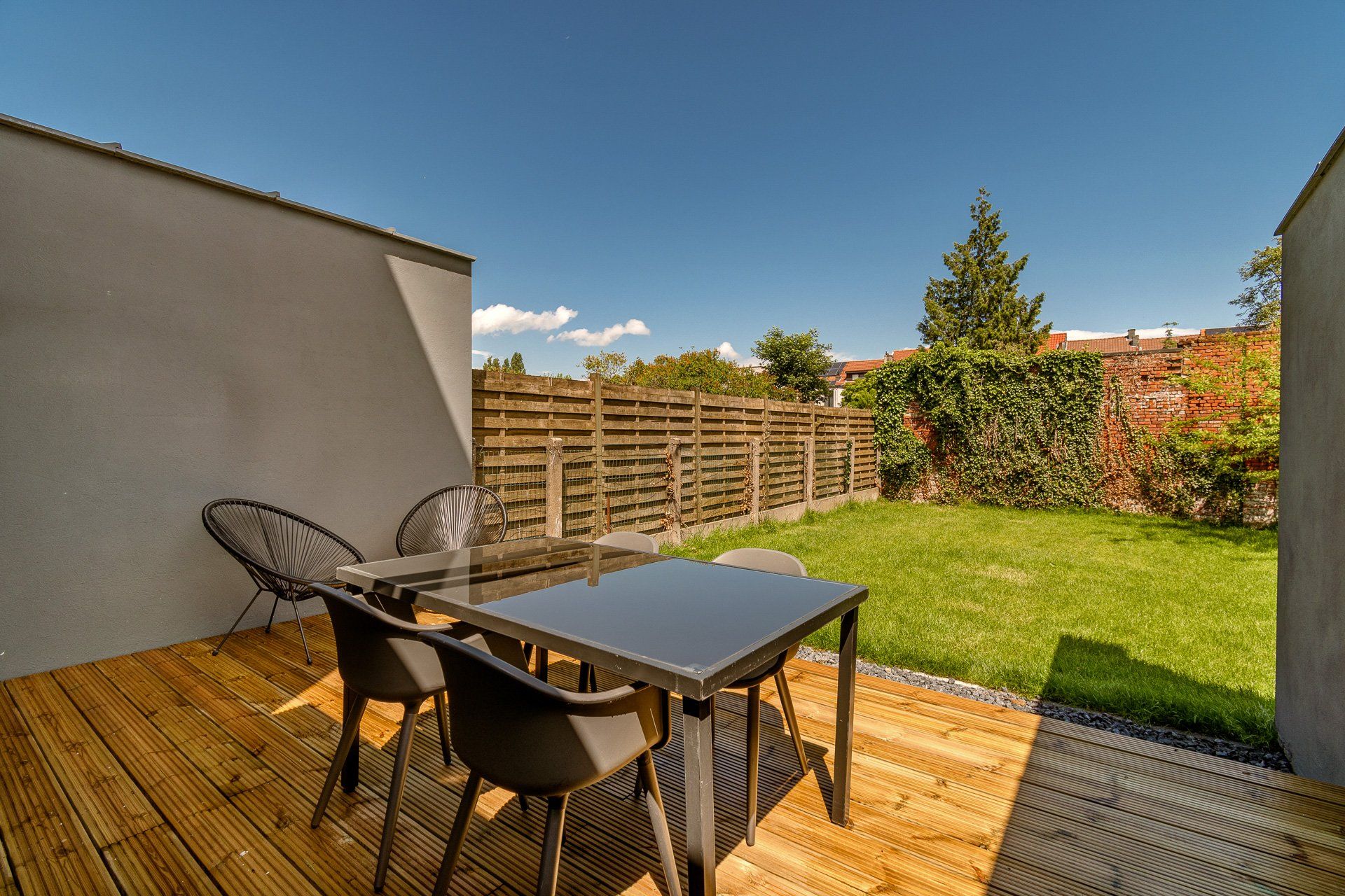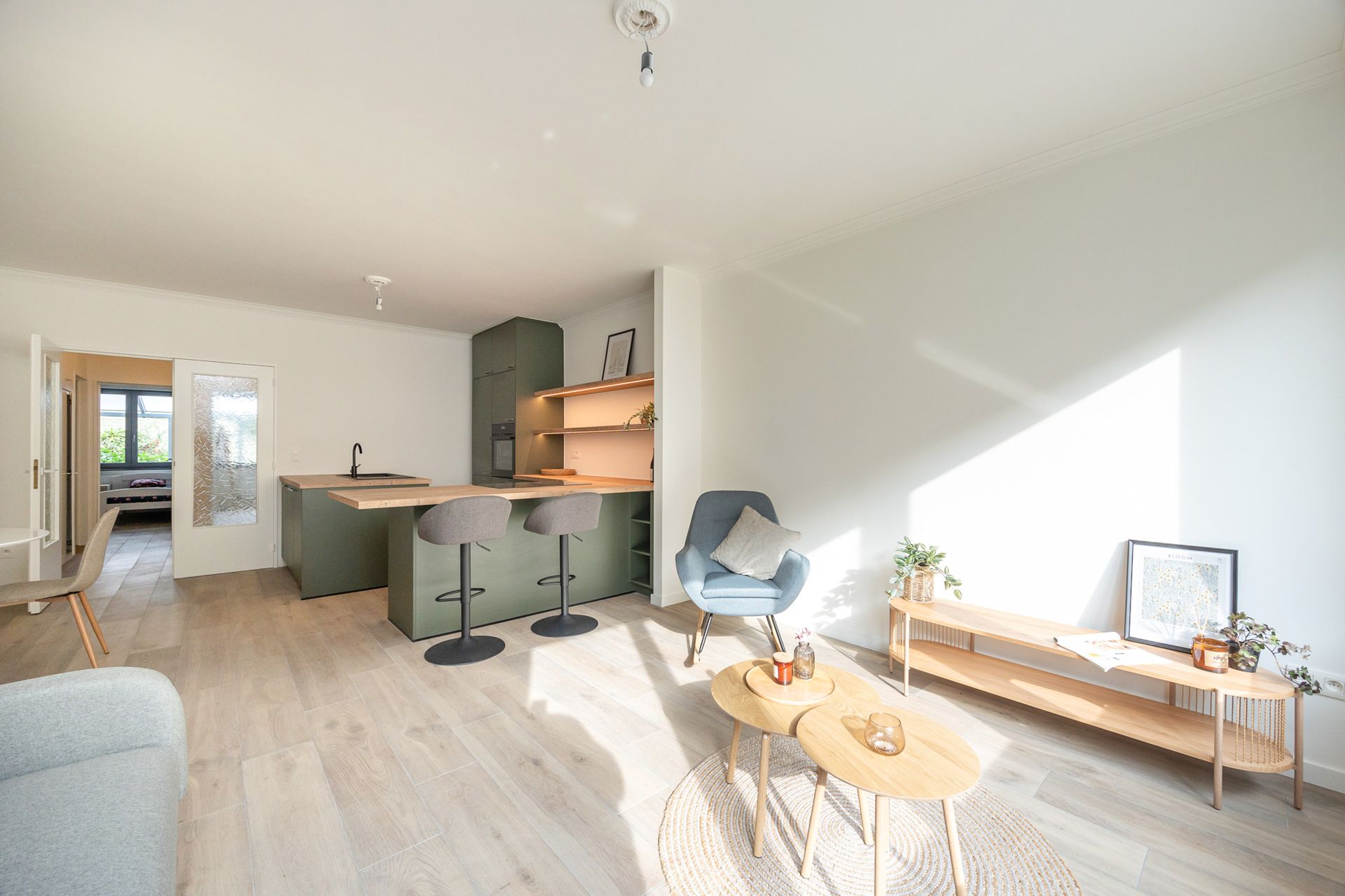 Volledig gerenoveerd gelijkvloers appartement met 2 slaapkamers, berging, tuin en garage.